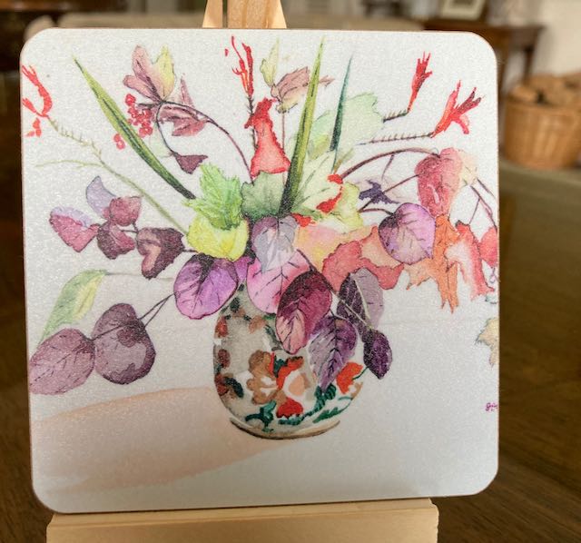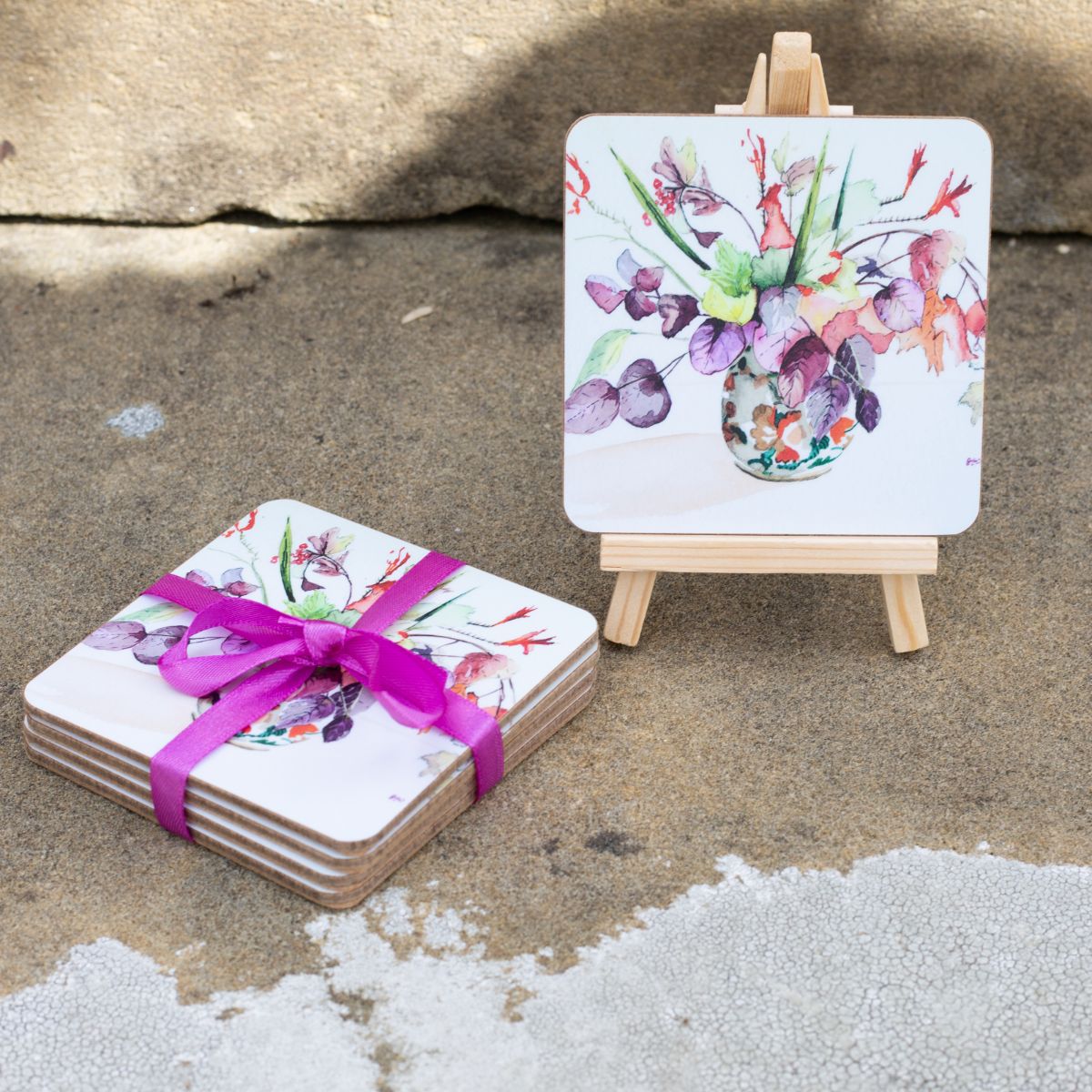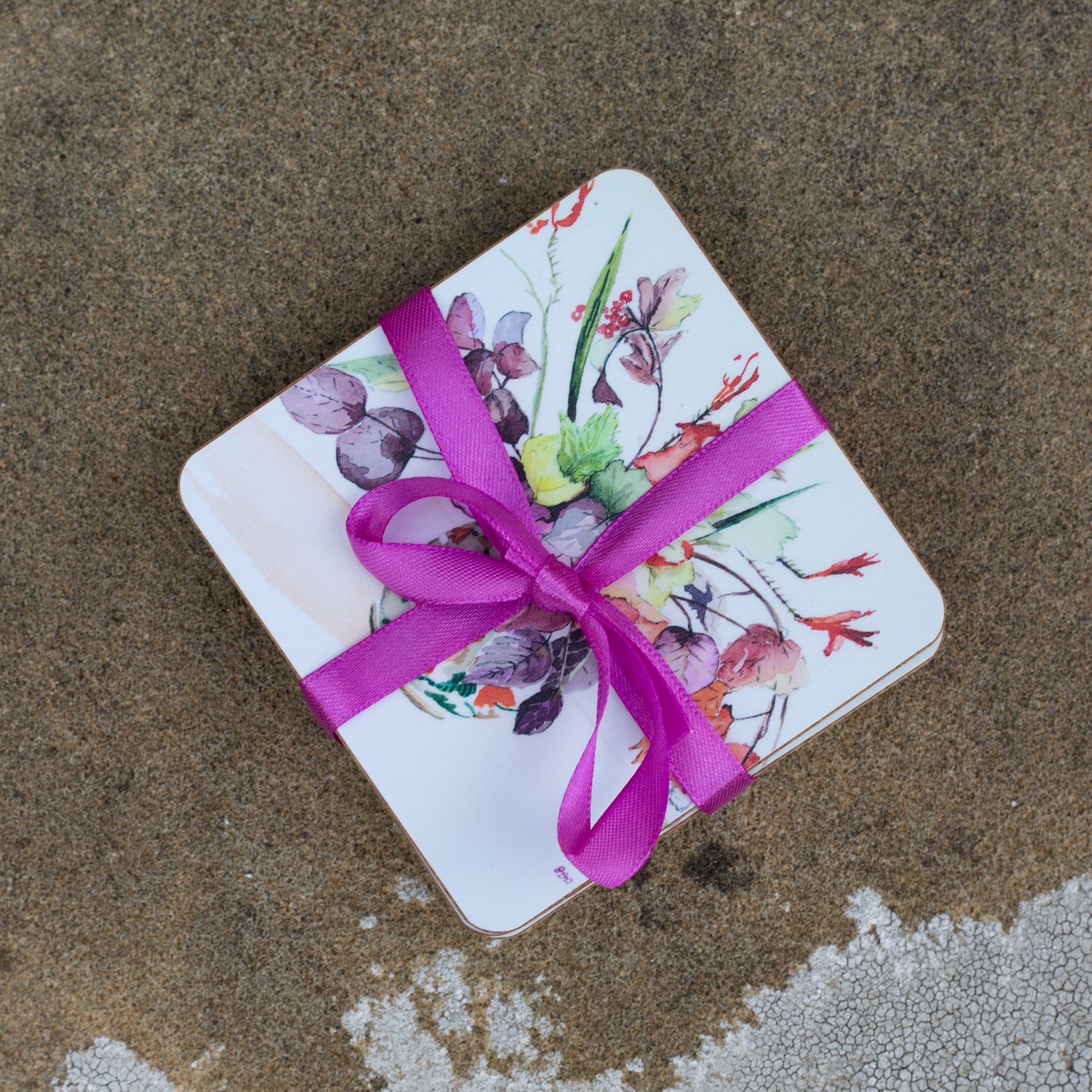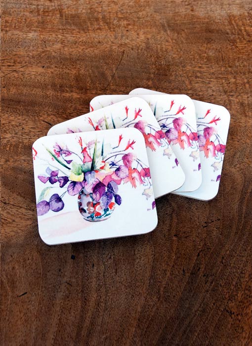 A set of 6 coasters which measure 10 x 10 cm. They have a matt finish and are easy to wipe clean. Cards and wrapping paper in the same design are also available. Set of 6 coasters in a unique design taken from a painting by Sarah.
