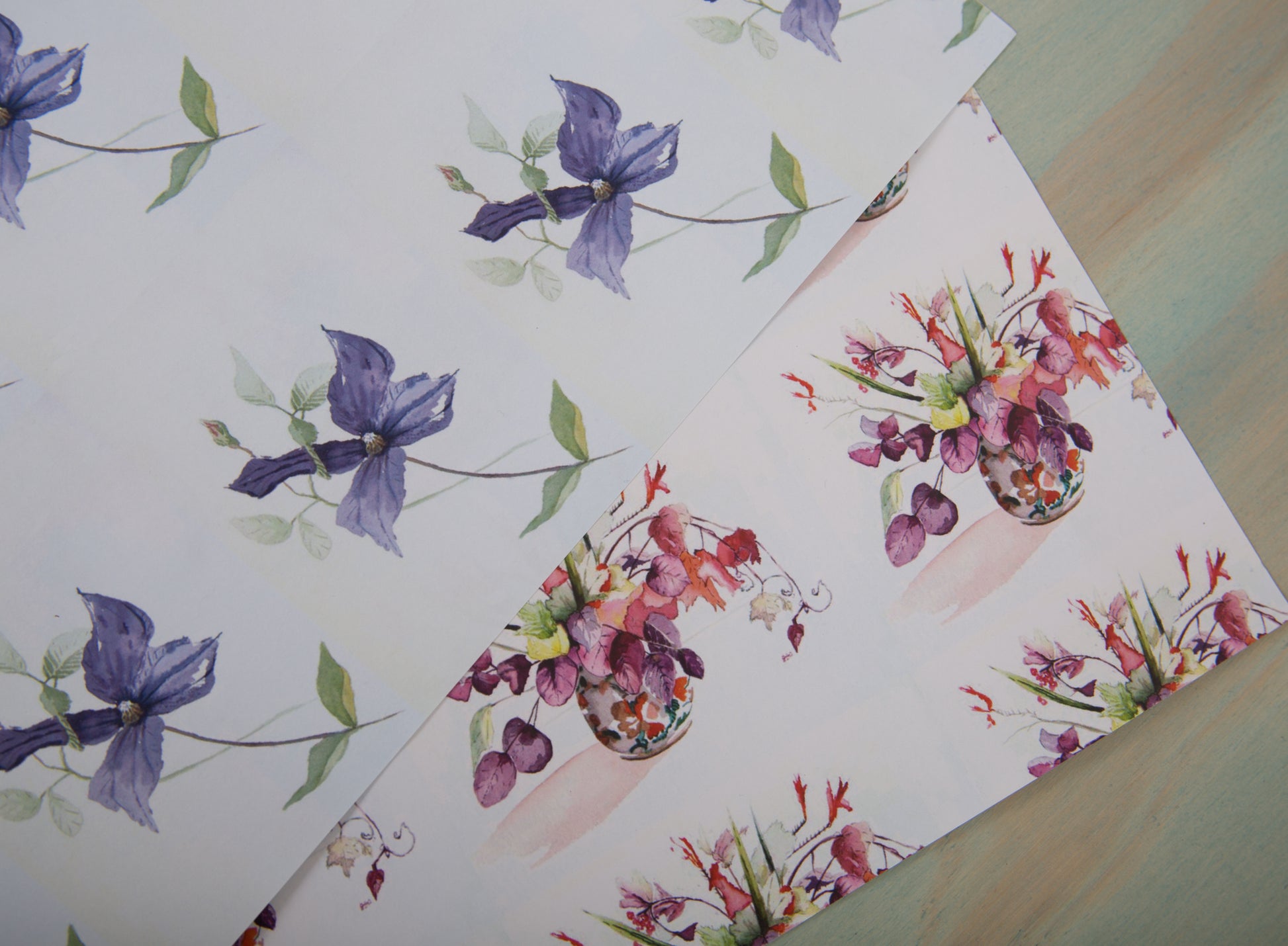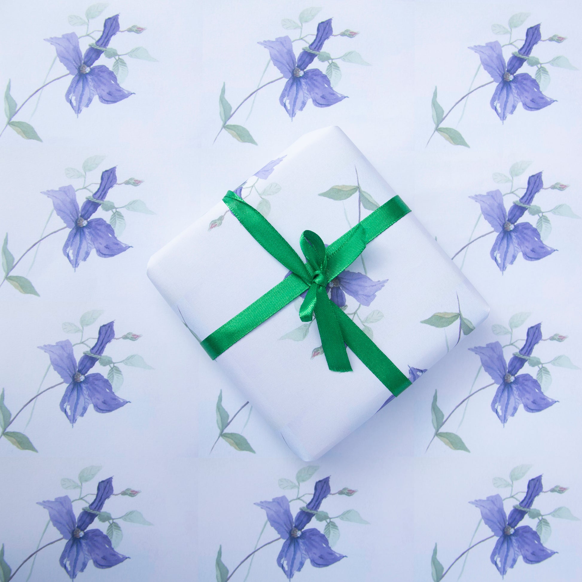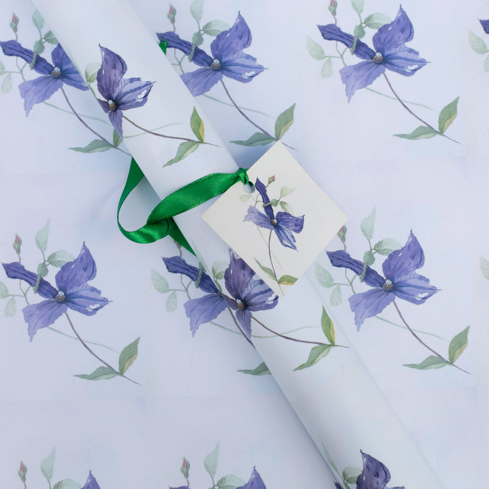 Two Sheets of Gift Wrapping Paper & Two Gift Tags in Clematis Design