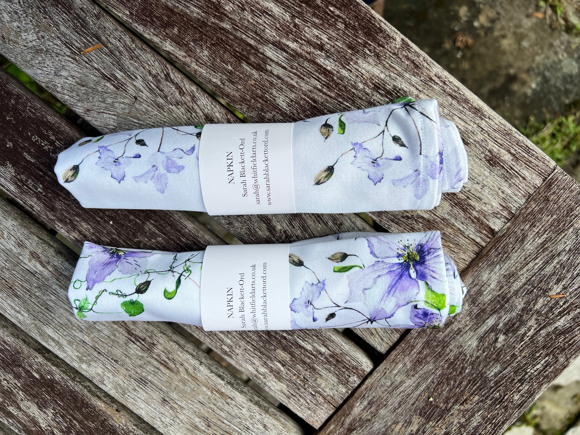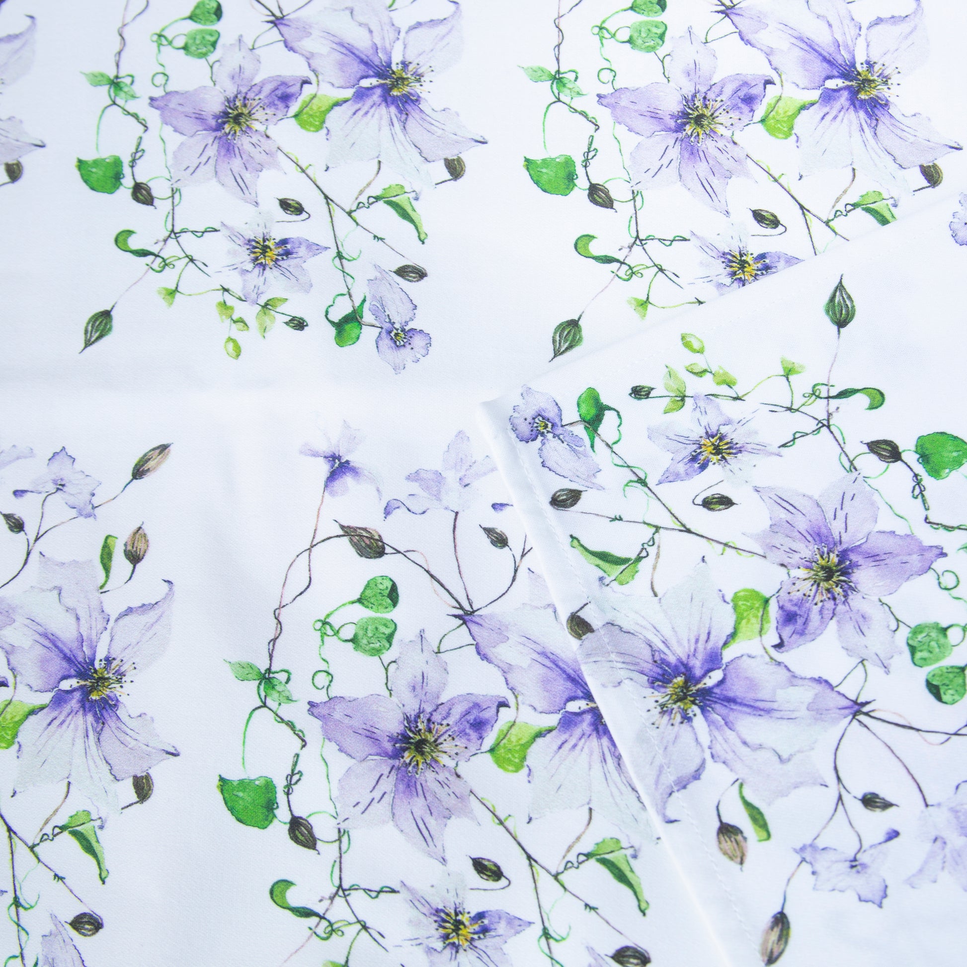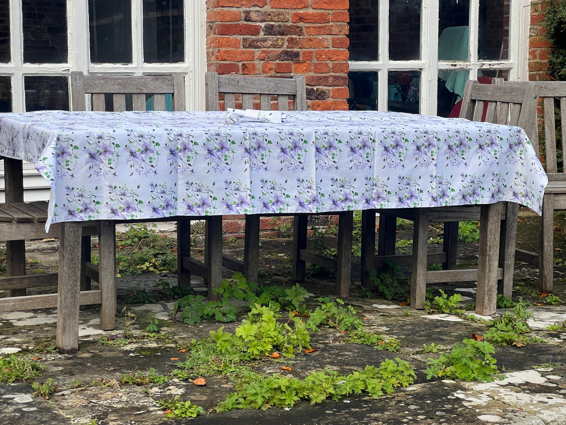Oblong tablecloth made from cotton in the UK. 7 x 4 ft. 213cm x 121 cm. This tablecloth can be paired with napkins in the same design. Taken from a painting of clematis in 2024. Machine washable and robust.