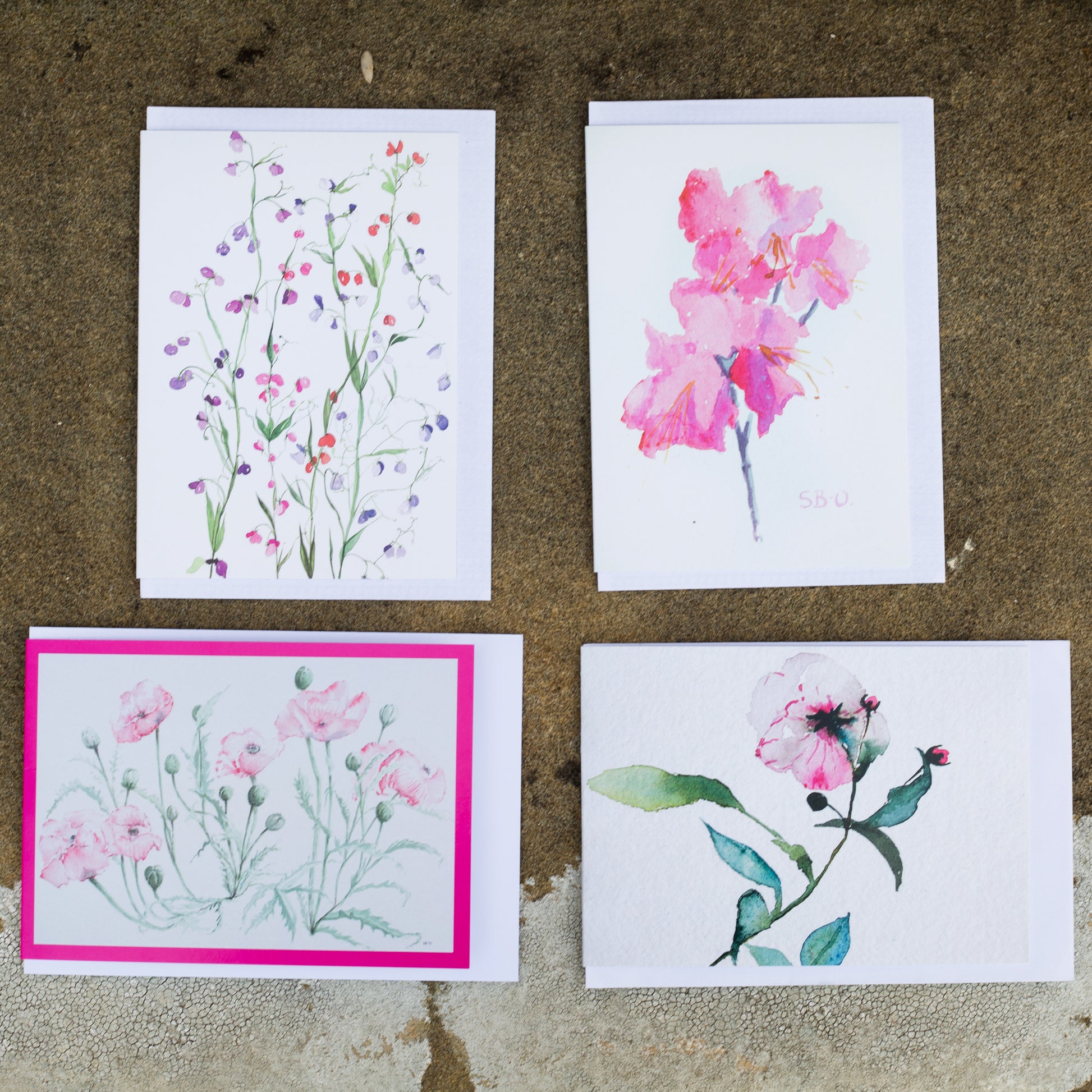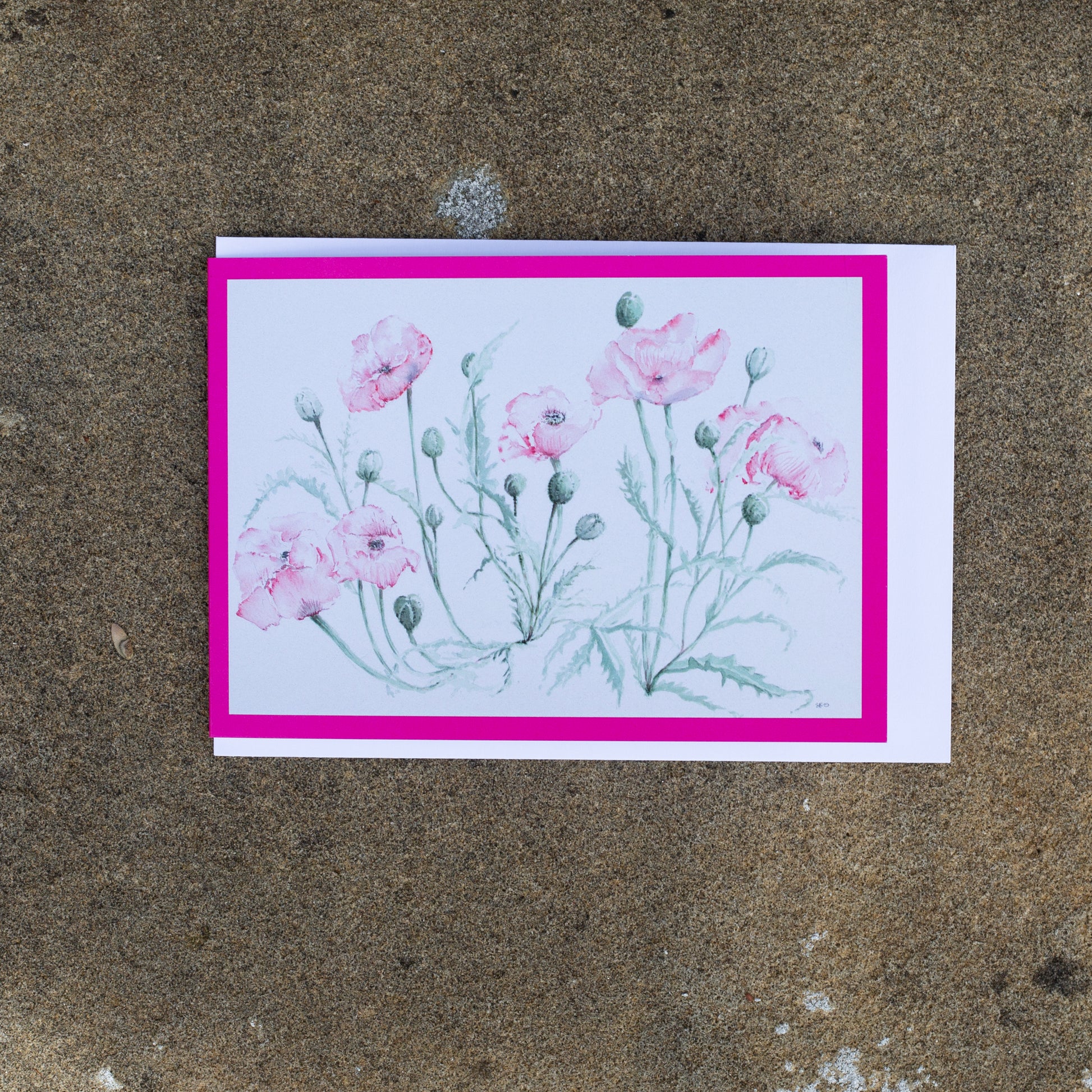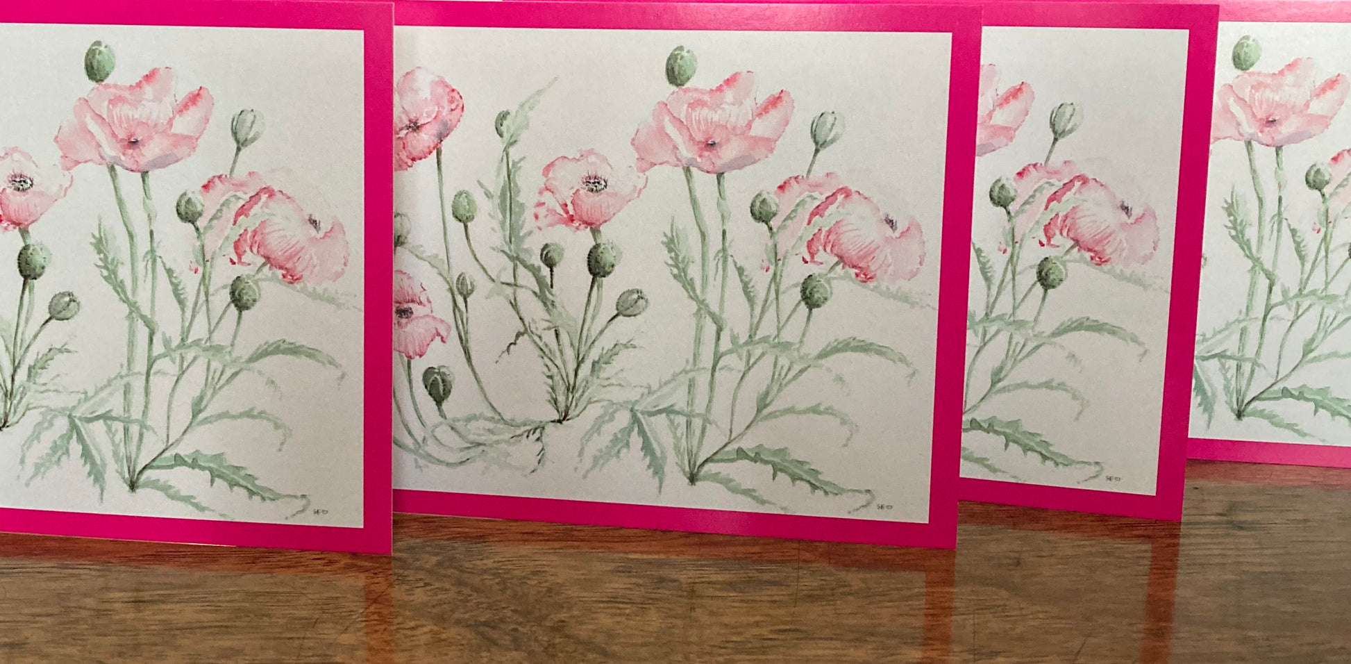 Greeting cards with unique design taken from Sarah's watercolour painting of pink poppies. This image is also included in the wrapping paper of poppies and roses...