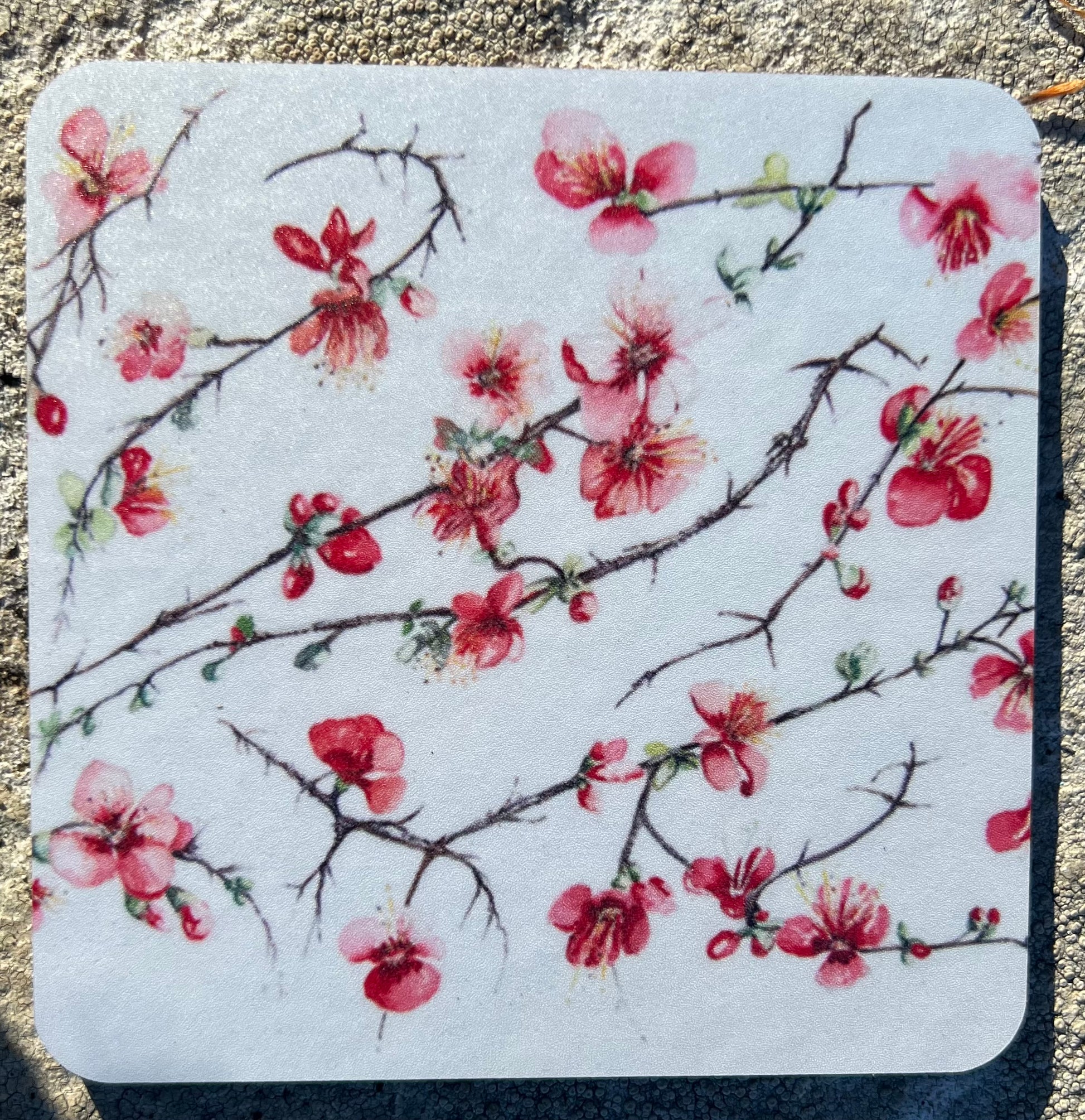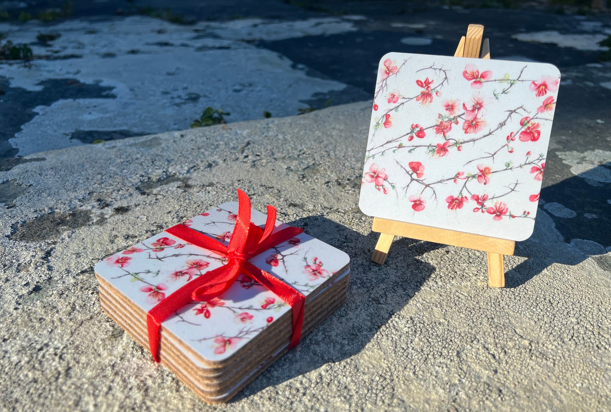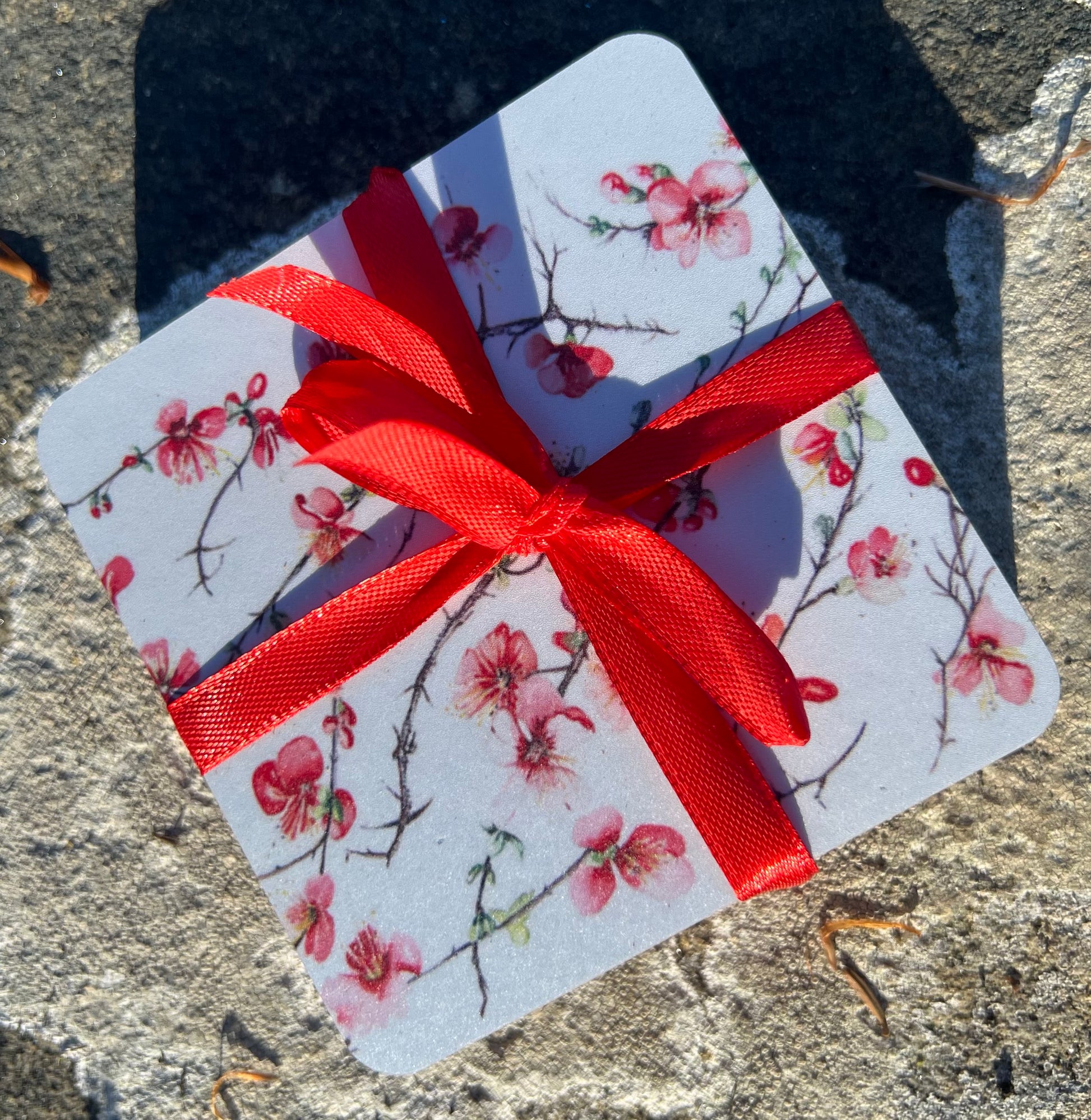 A set of 6 square coasters with a bright red design taken from a decorative quince tree, tied with ribbon.