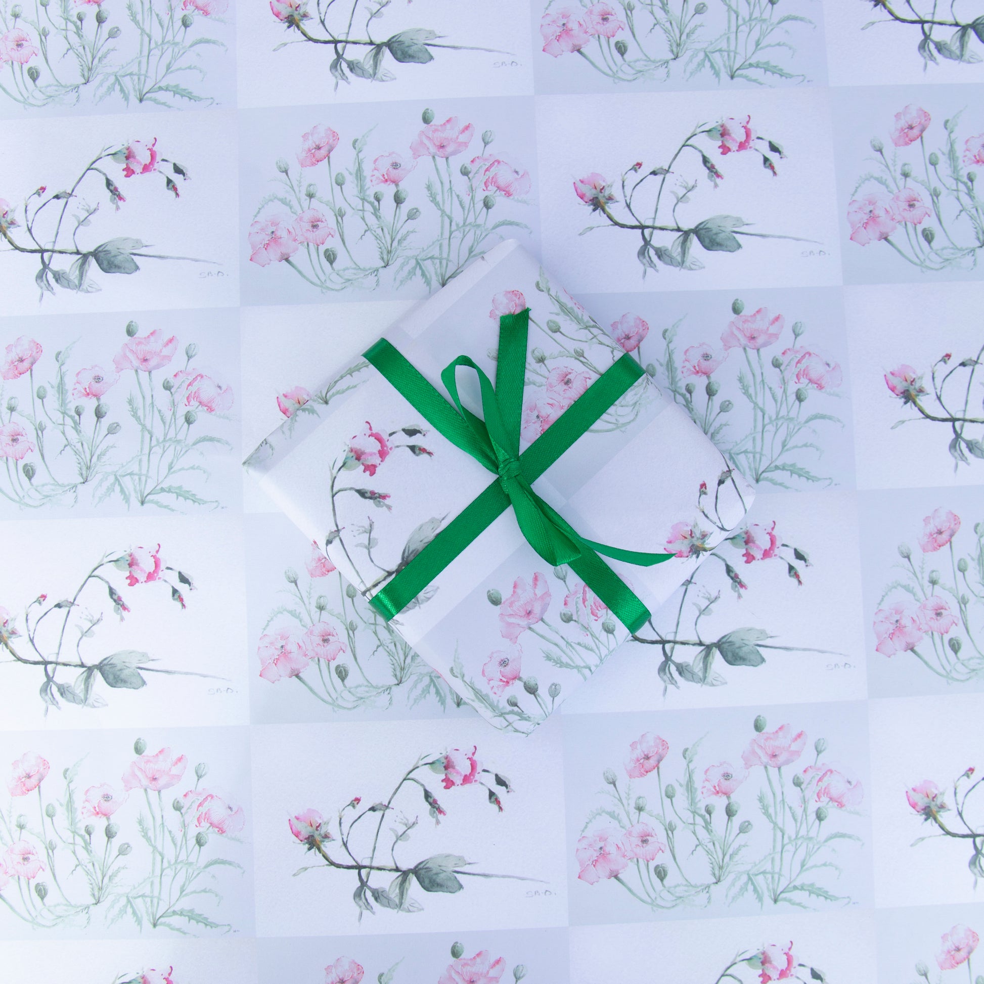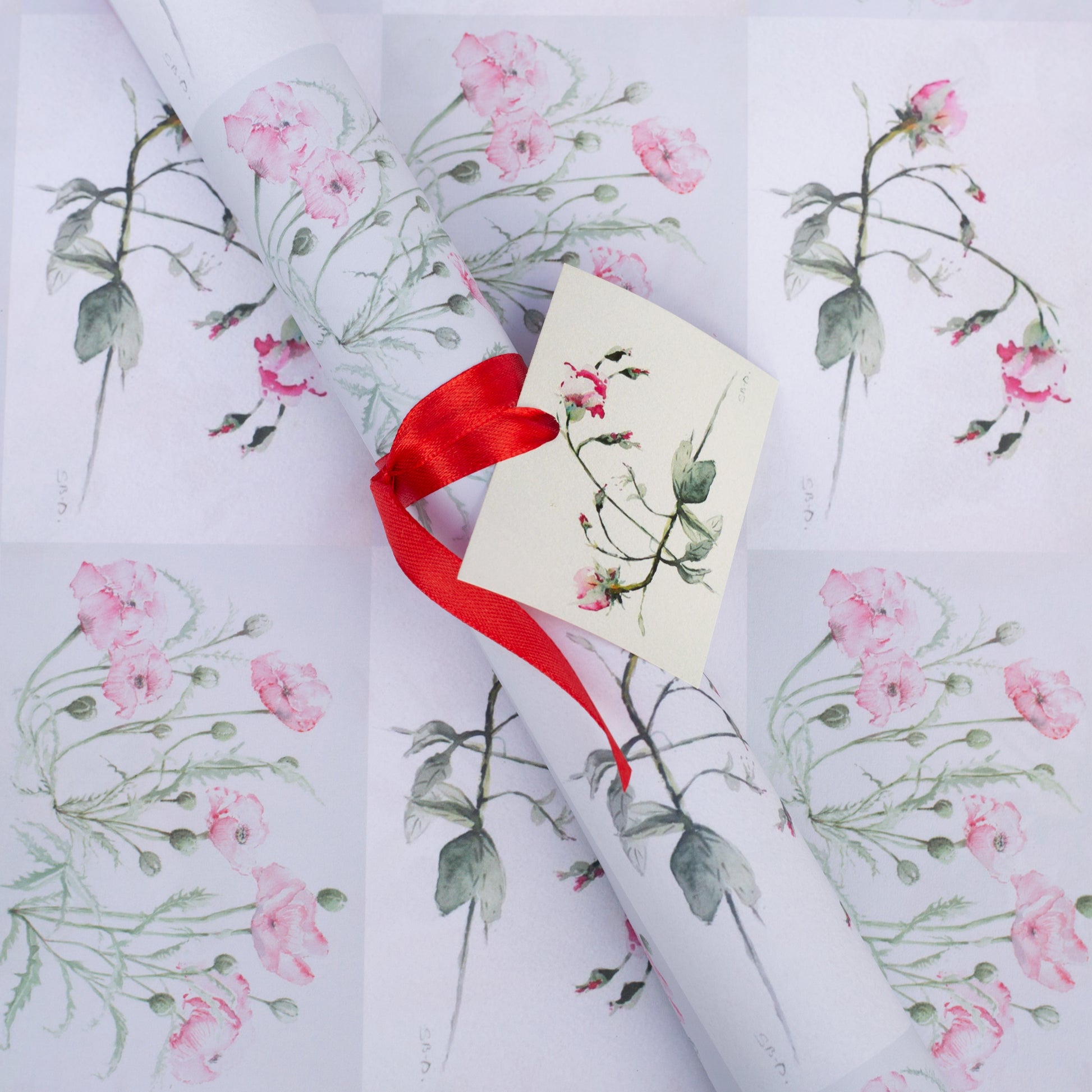 This unique wrapping paper is designed using two of Sarah's images from her watercolour collection : Dusky Poppies and Roses. Two Gift tags are included, one poppy and one roses with ribbons attached. Cards in the same design are also available and a variety of other wrapping papers with tags.